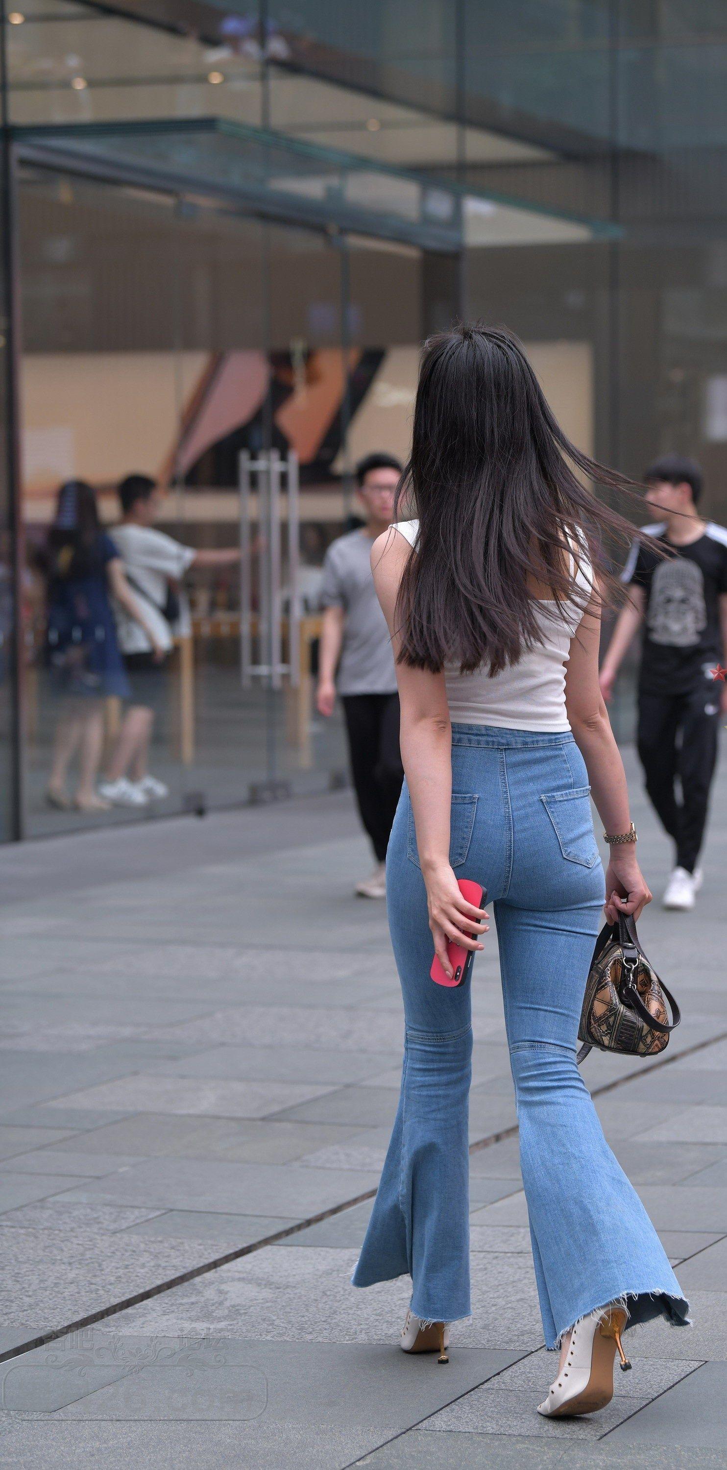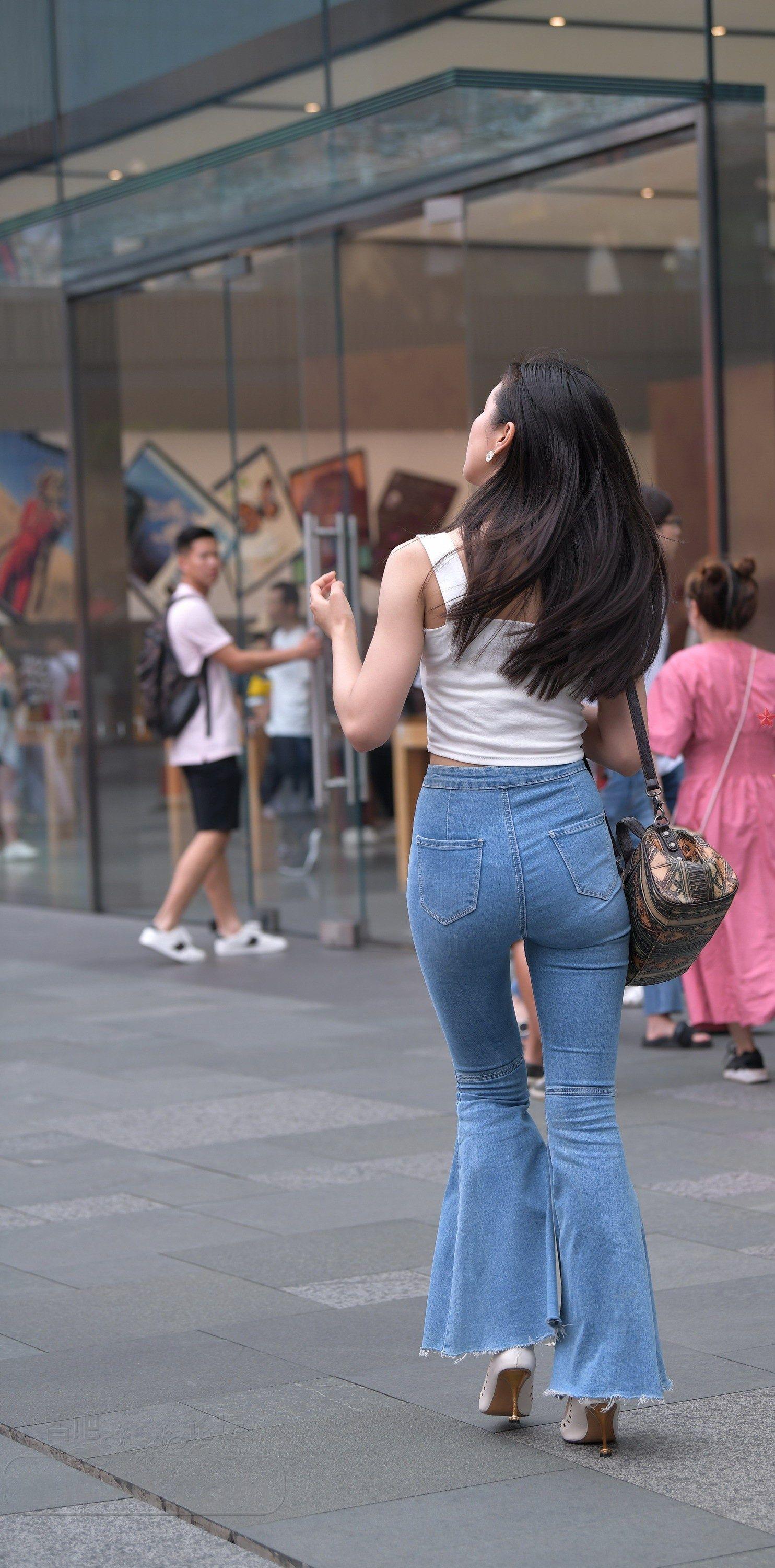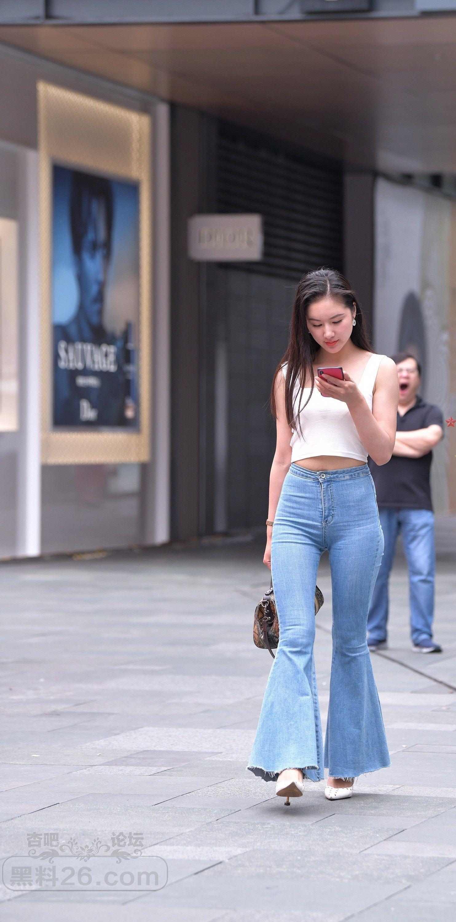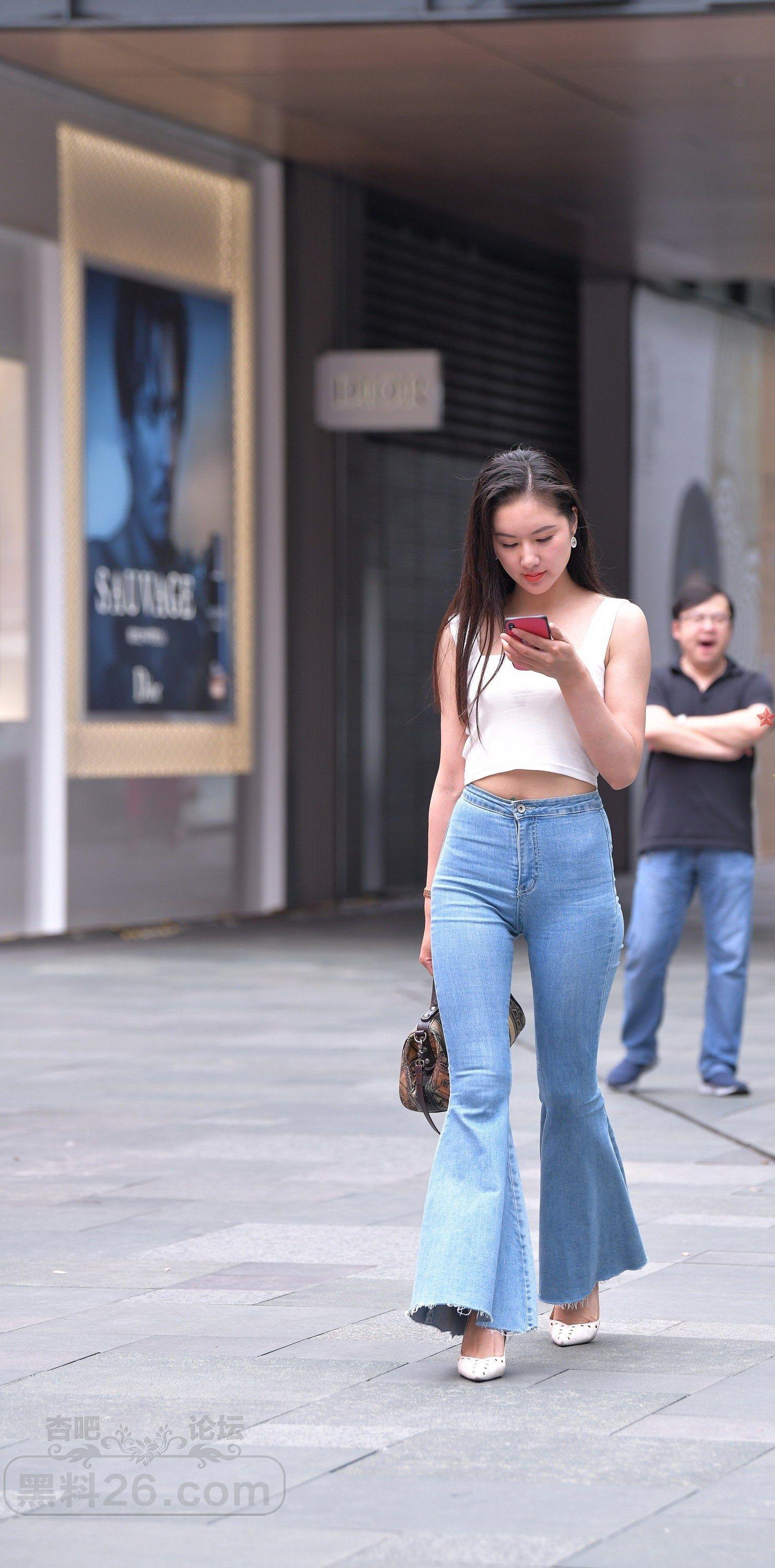 白色吊带背心牛仔喇叭裤长发美女小蛮腰外露【10P】