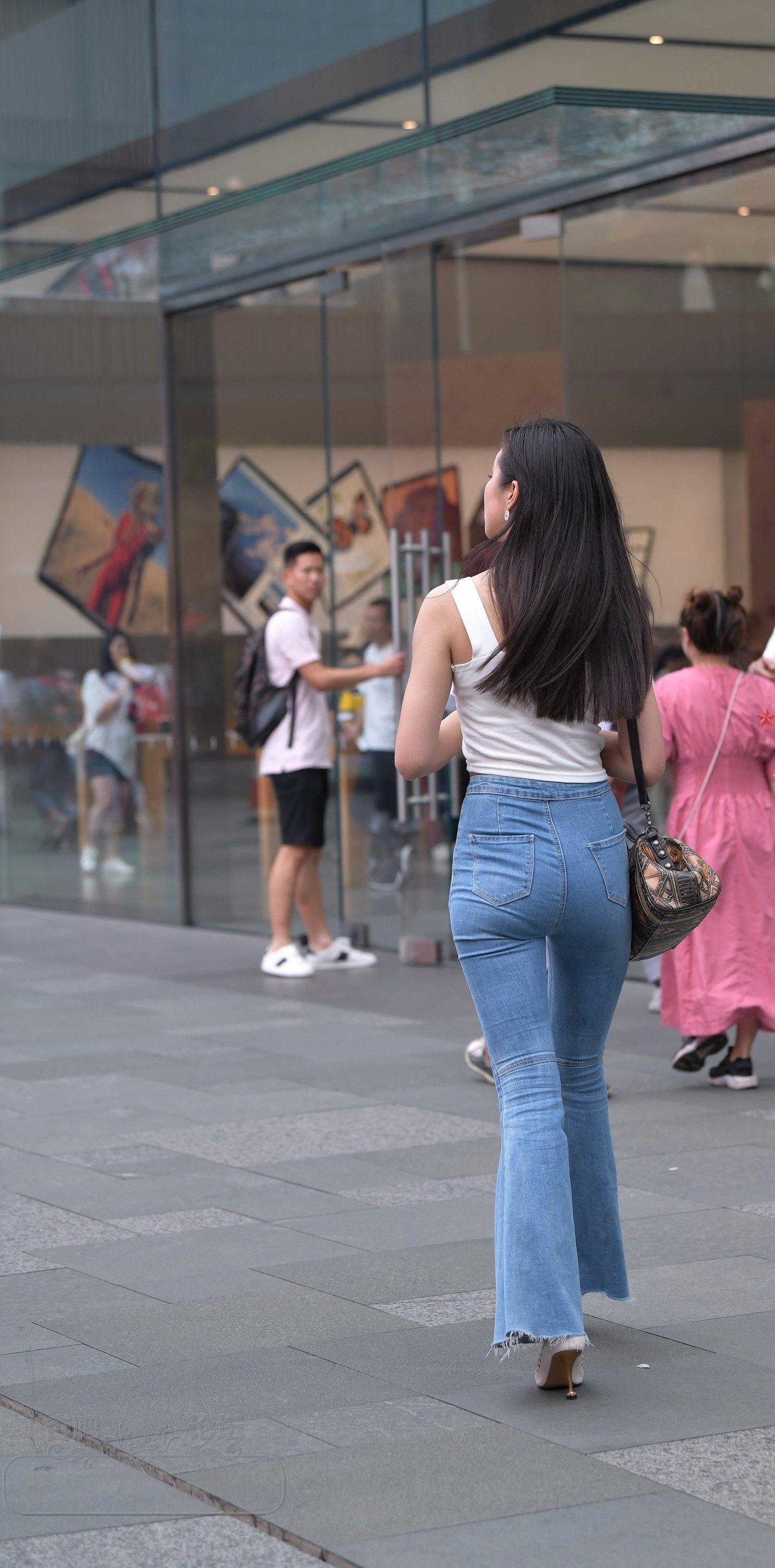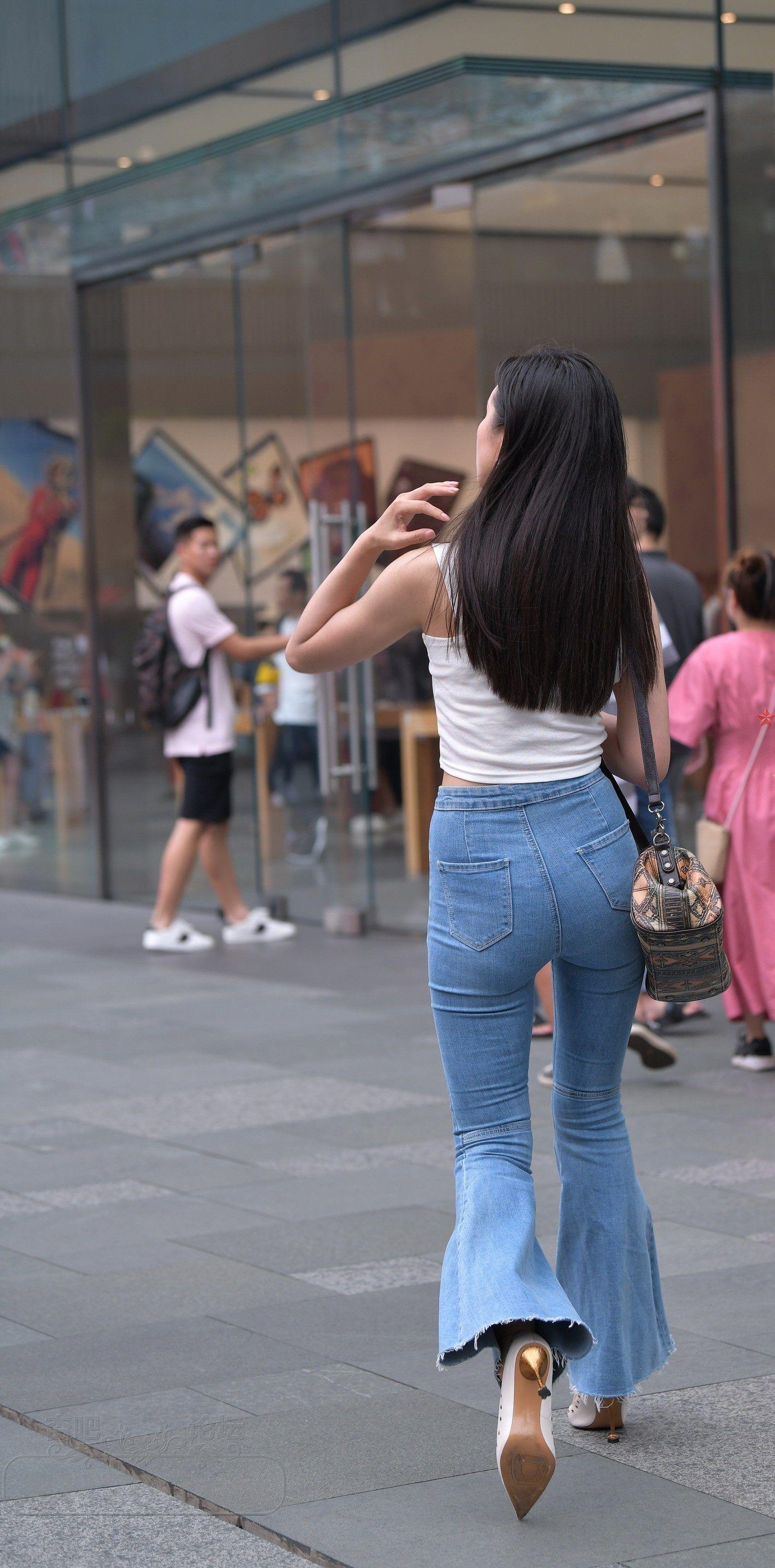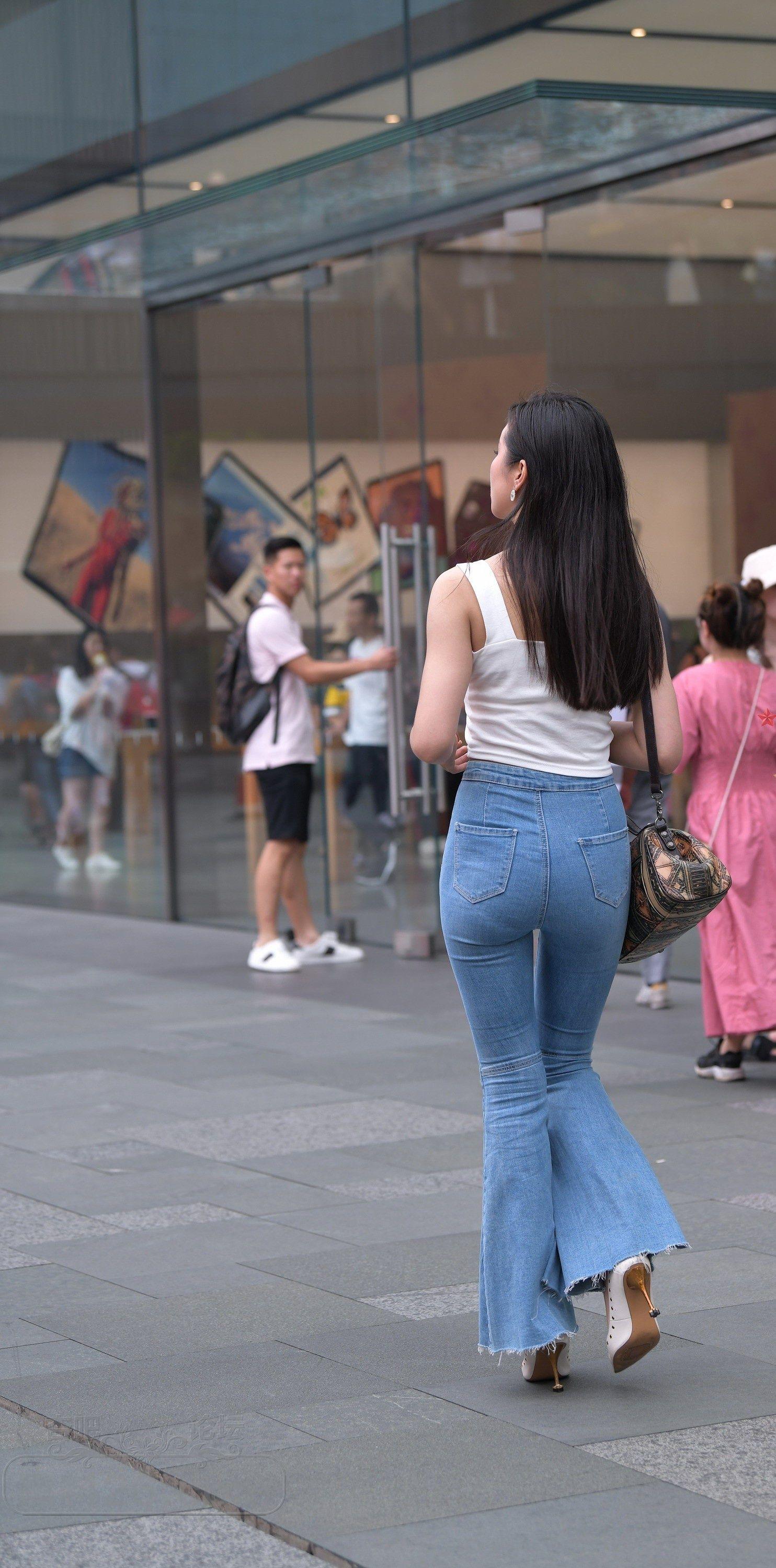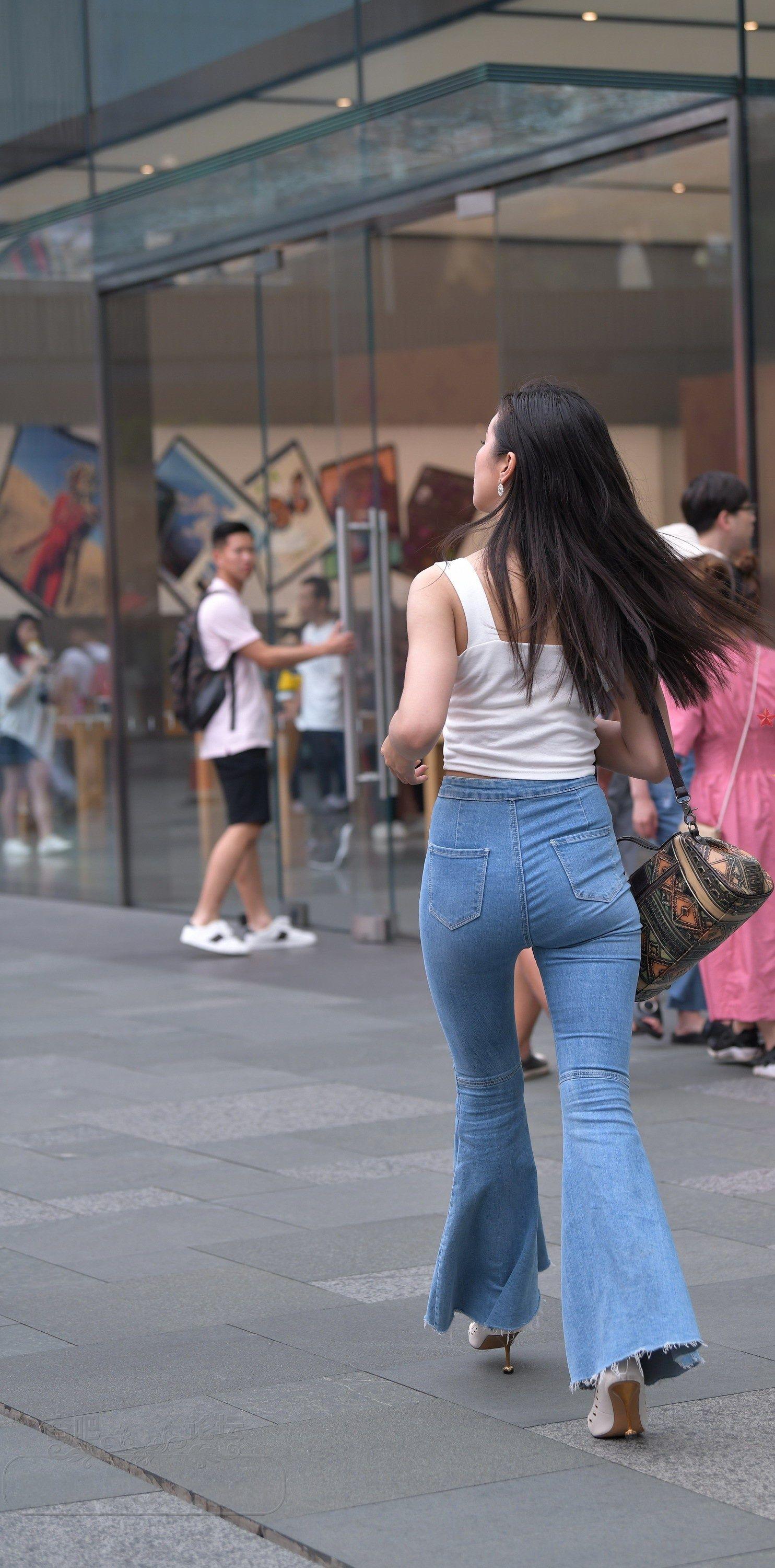 白色吊带背心牛仔喇叭裤长发美女小蛮腰外露【10P】
