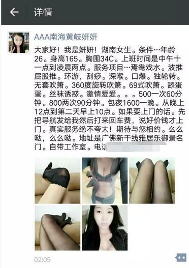 标题没有写联系成功的帖子请谨慎购买,不一定能联系成功的,先钱不可信 【寻欢时间】:2016年11月 【寻欢地点】:黄岐南海黄岐,广佛新干线御景名门 【信息来源】:网络 【服务项目】:波推,屁股推管、深喉口爆、丝袜、爱爱、KJ,强J式、老汉推车、阴阳同体! 【妹妹数量】:没问 【环境设备】:该有都有 【营业时间】:这个需要自己问 【价格一览】:一次60分钟500,两次90分钟800 包夜1600晚上12点到第二天早上10点。如果要上门的话,先打来回车费,900起步 【安全评估】:不去最安全 【服务星级】:70 【重点推荐】:无 【寻欢细节】:就是粉多了点 【总体评价】:略 【联系方式】: